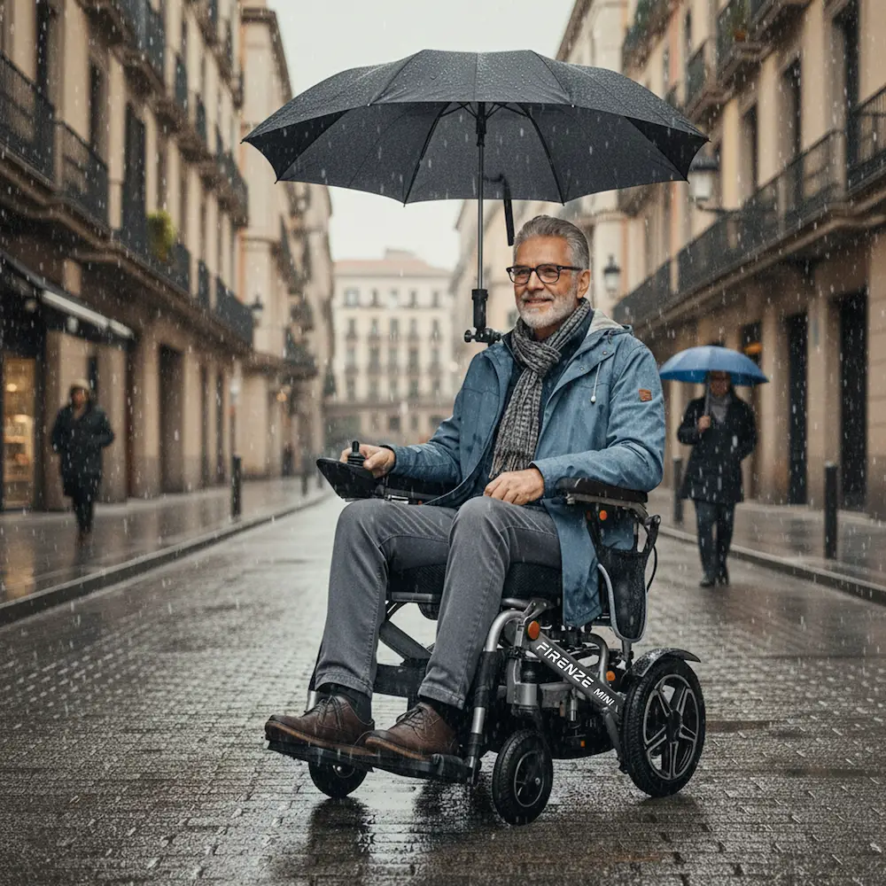 El paraguas es compatible con numerosos modelos de sillas de ruedas eléctricas, como por ejemplo Firenze, Bologna y otros modelos similares.